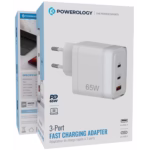 آداپتور شارژ سریع ۳ پورت Powerology Lunex به رنگ سفید، همراهی ایدهآل برای هر مسافری است که به شارژ سریع و قابل اعتماد نیاز دارد.