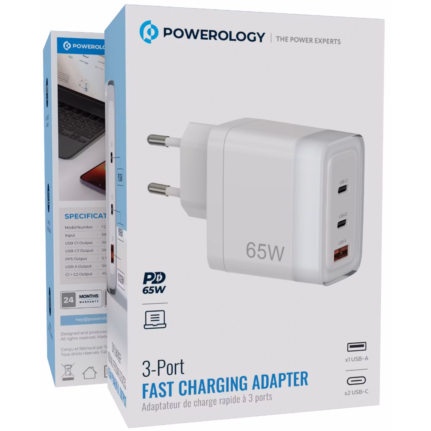 آداپتور شارژ سریع ۳ پورت Powerology Lunex به رنگ سفید، همراهی ایدهآل برای هر مسافری است که به شارژ سریع و قابل اعتماد نیاز دارد.
