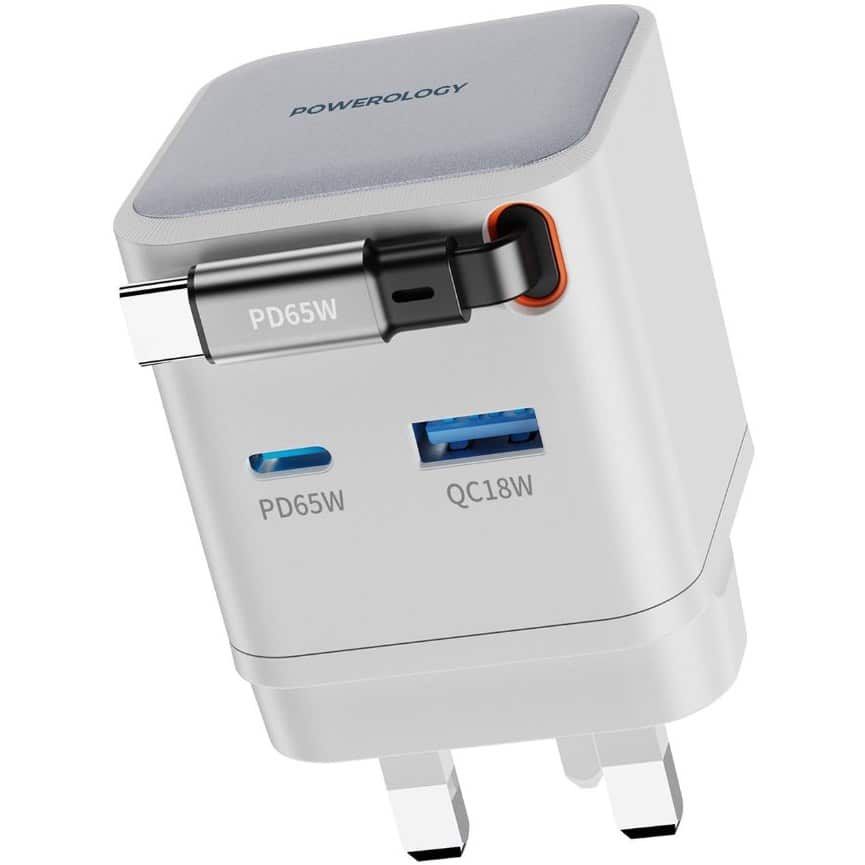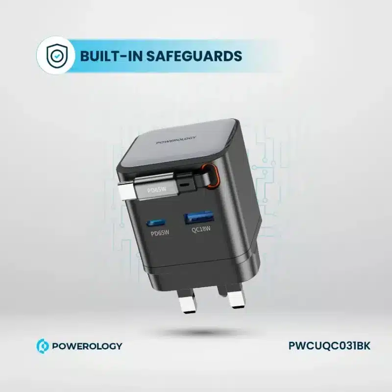 شارژر GaN قابل جمع شدن Powerology Dual Port یک راه حل شارژ همه کاره و با کارایی بالا است که می تواند چندین دستگاه را به سرعت شارژ کند. حداکثر خروجی آن 65 وات برای شارژ سریع USB-C و USB-A است. در اینجا، کابل و پورت خروجی 65 وات را بدون زحمت فراهم میکنند و قابلیت شارژ سریع لپتاپ، تبلت و گوشیهای هوشمند تا حداکثر 18 وات را از طریق درگاه USB-A برای دستگاههای دیگر اضافه میکنند. هنگامی که به همه پورت ها به طور همزمان وصل می شود، خروجی ترکیبی 65 وات با تضمین شارژ همزمان سه دستگاه وجود خواهد داشت. کابل جمع شونده Type-C 75 سانتی متر است که با سازماندهی و بدون گره خوردن، قابلیت حمل راحت را اضافه می کند. مواد PC مات نسوز در ساخت و ساز استفاده می شود که ایمنی را تضمین می کند اما در طول زمان خراب نمی شود. سایر ویژگی ها، مانند محافظ های داخلی در برابر گرمای بیش از حد، شارژ بیش از حد و اتصال کوتاه، از این امر پشتیبانی می کنند. طراحی ثبت اختراع و دوشاخه 3 پین بریتانیا به آن سبکی فوقالعاده و کاربردی میدهد. این شارژر می تواند دستگاه ها را از 0% تا 60% تنها در 35 دقیقه تغذیه کند و آن را به شارژر ایده آلی برای برق سریع، ایمن و مطمئن در خانه یا در حال حرکت تبدیل می کند.