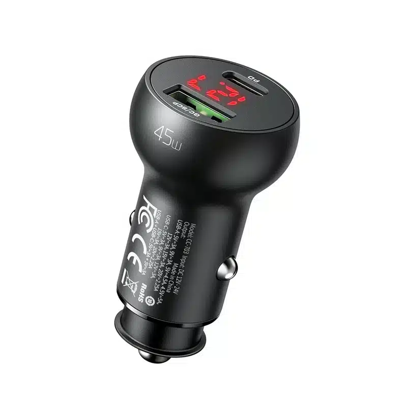 بدنی فلزی ( آلومینیومی ) ، جلوگیری کننده از افزایش دما دارای نمایشگر LED ساپورت تمامی برندها و مدل های گوشی و فناوری های شارژ اپل و شیاومی و سامسونگ و حتی سوپر فست شارژ هوآوی و … قابلیت شارژ لپ تاپ و مک بوک و … قابل استفاده برای تمامی انواع خودرو های سواری ، کامیون و کامیونت و … شدت جریان خروجی پورت یو اس بی تا سقف ۴۵W وات ( هوشمند ) شدت جریان خروجی پورت تایپ سی تا ۴۵W وات ( هوشمند ) در صورت استفاده همزمان از دو پورت ، هر پورت ۱۵W وات خروجی دارد شارژ ایمن و دارای محافظ افت جریان برق و یا افزایش جریان برق و تغییرات وولتاژ