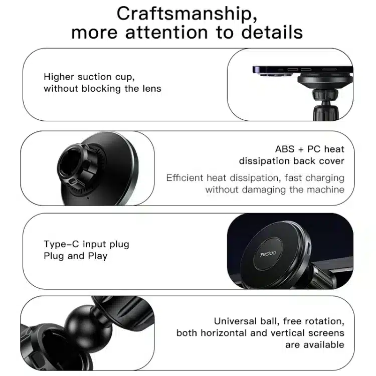 محصولی از کارخانه یسیدو است. هولدر از جنس پلاستیک با مقاوم ABS و پلیمر کربنات و سیلیکون است.آهنربای ربیدیومی حلقه ای با کشش بسیار قوی که گوشی نمیافتد.میدان مغناطیسی آهنربا با سیگنال های موبایل تداخل ندارد.سطح هولدر از جنس سیلیکون نرم به جهت محافظت از موبایل است.هولدر با صفحه به قطر 6.3cm و پایه 9cm و وزن 70 گرم بسیار جمع و جور است و دید رانننده را محدود نمیکند.دارای خاصیت چرخش 360 درجه است.بر روی دریچه هوا نصب میشود و با انواع خودرو ها سازگاری دارد.به راحتی و با یک دست موبایل را بر هولدر نصب کنید و بردارید.این هولدر یک شارژر وایرلس فست شارژ هم با توان خروجی 15 وات است.مناسب شارژ گوشی های آیفون 12/13/14/15 به دلیل مگنت داخلی است و خاصیت نگهداری بقیه گوشی ها با وصل کردن حلقه مگ سیف را دارد.دارای ورودی تایپ سی جهت انتفال شارژ است