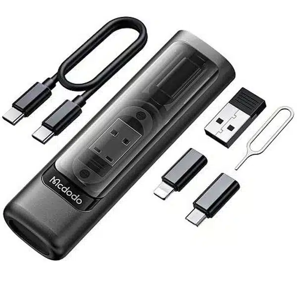 تبدیل های مختلف | کانکتورهای فلزی | قابل حمل | پشتیبانی از تکنولوژی PD | امکان انتقال دیتا | پروتکل های شارژ سریع – پک کابل چند منظوره Mcdodo WF-۱۷۲۰ دارای یک کابل ۳۰ سانتی متری تایپ سی، یک تبدیل لایتنینگ، یک تبدیل میکرو یو اس بی، یک تبدیل USB و یک سوزن سیم کارت می باشد.