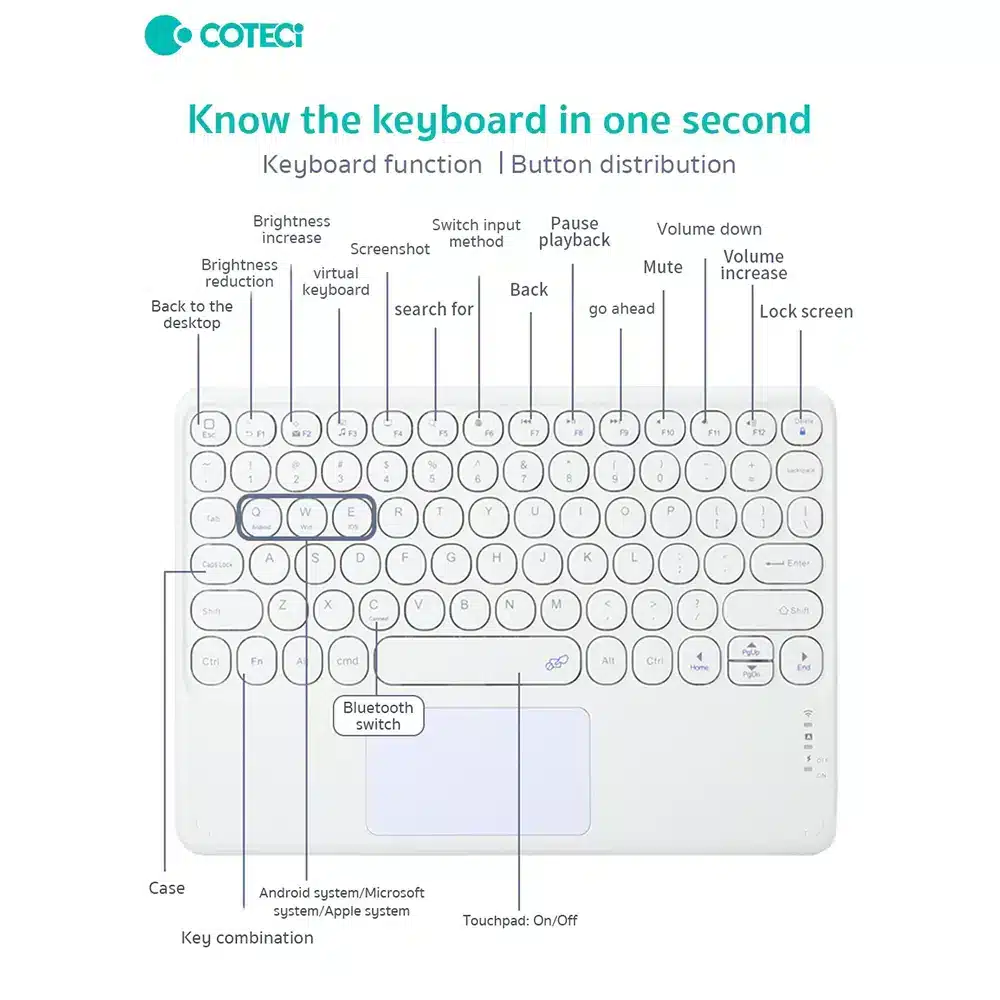 کیبورد بلوتوثی سه حالته کوتتسی مدل Coteetci 64001 انتخابی هوشمندانه برای کسانی است که به دنبال یک کیبورد سبک، جمع‌وجور و در عین حال پرکاربرد هستند. این صفحه کلید بی‌سیم از طریق فناوری بلوتوث به راحتی به انواع دستگاه‌ها از جمله گوشی‌های هوشمند، تبلت‌ها، لپ‌تاپ‌ها و حتی برخی تلویزیون‌های هوشمند متصل می‌شود. اگر به دنبال کیبوردی هستید که فضای کمی را اشغال کند اما تایپ با آن راحت و روان باشد، مدل 64001 کوتتسی دقیقاً همان چیزی است که نیاز دارید.