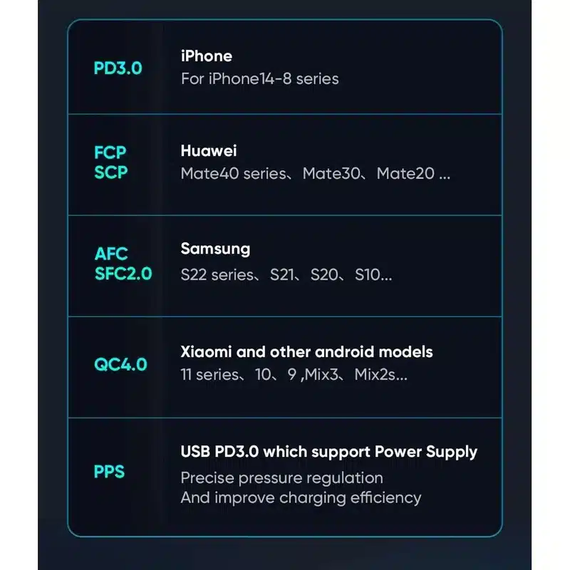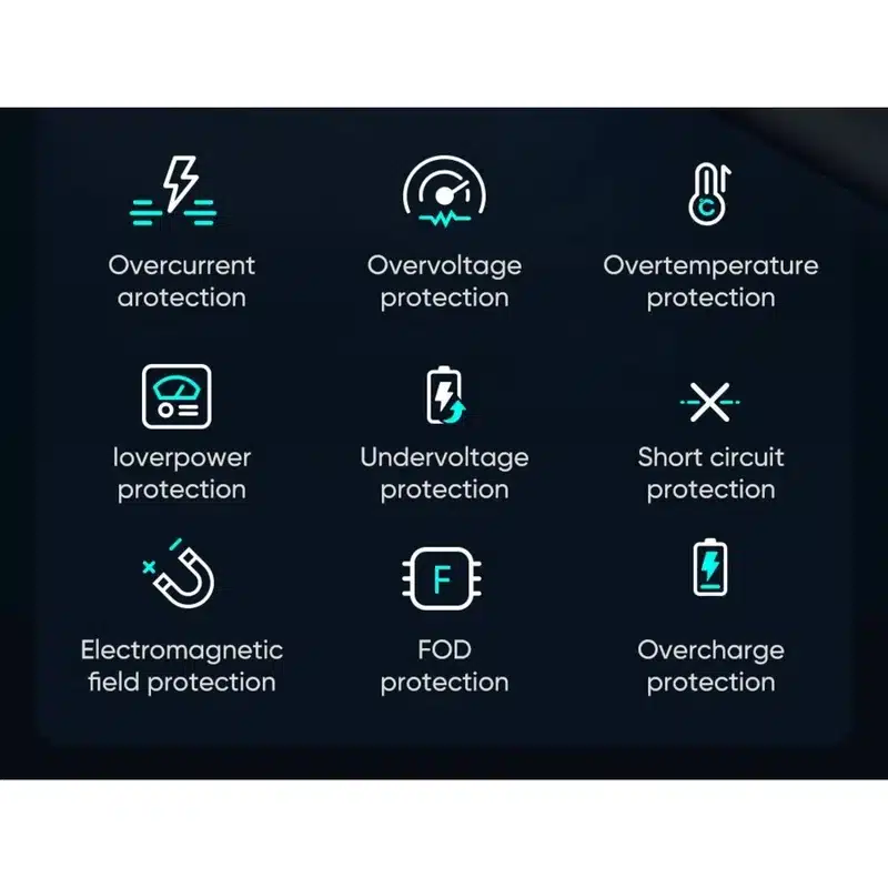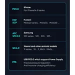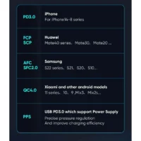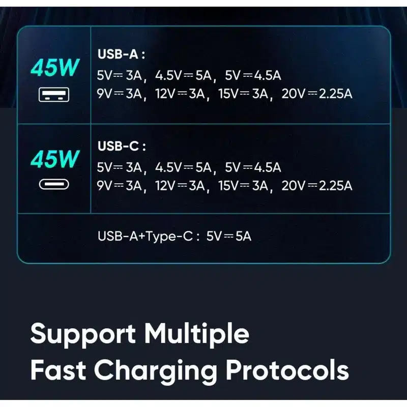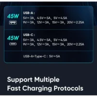 پشتیبانی از پروتکلهای شارژ سریع متعددی مانند PD۳.۰ و QC۴.۰+ و توان خروج ۴۵ وات که میتواند زیر نیم ساعت شارژ گوشی شمارا از ۰ به ۶۰% و یا بالاتر برساند. مجهز به سیستمهای محافظت در برابر جریان بیش از حد، ولتاژ بالا و دمای بالا. |