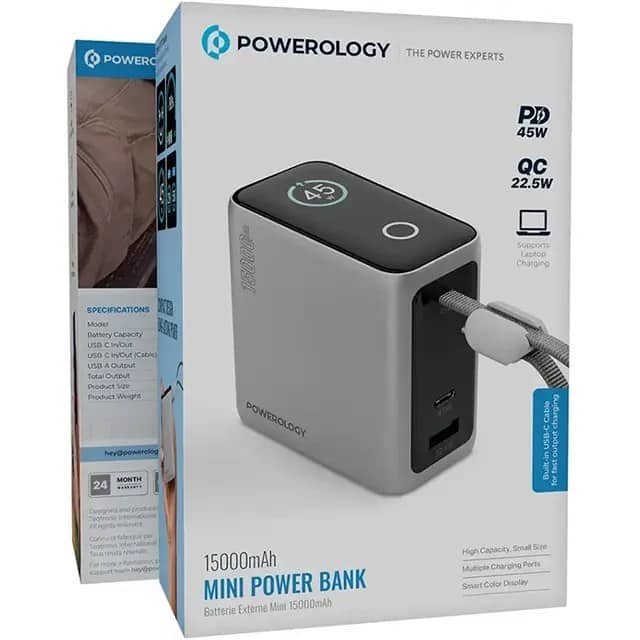 پاوربانک مینی پاورولوژی Powerology 15000mAh Mini Power Bank ، قدرتی چشمگیر را در طراحی بسیار شیک و قابلحمل ارائه میدهد. چندین پورت شارژ، سازگاری با دستگاههای سیمی را تضمین میکند و شامل USB-C و USB-A است؛ فناوریهای شارژ سریع PD ۴۵ وات و QC ۲۲.۵ وات پشتیبانی میشود